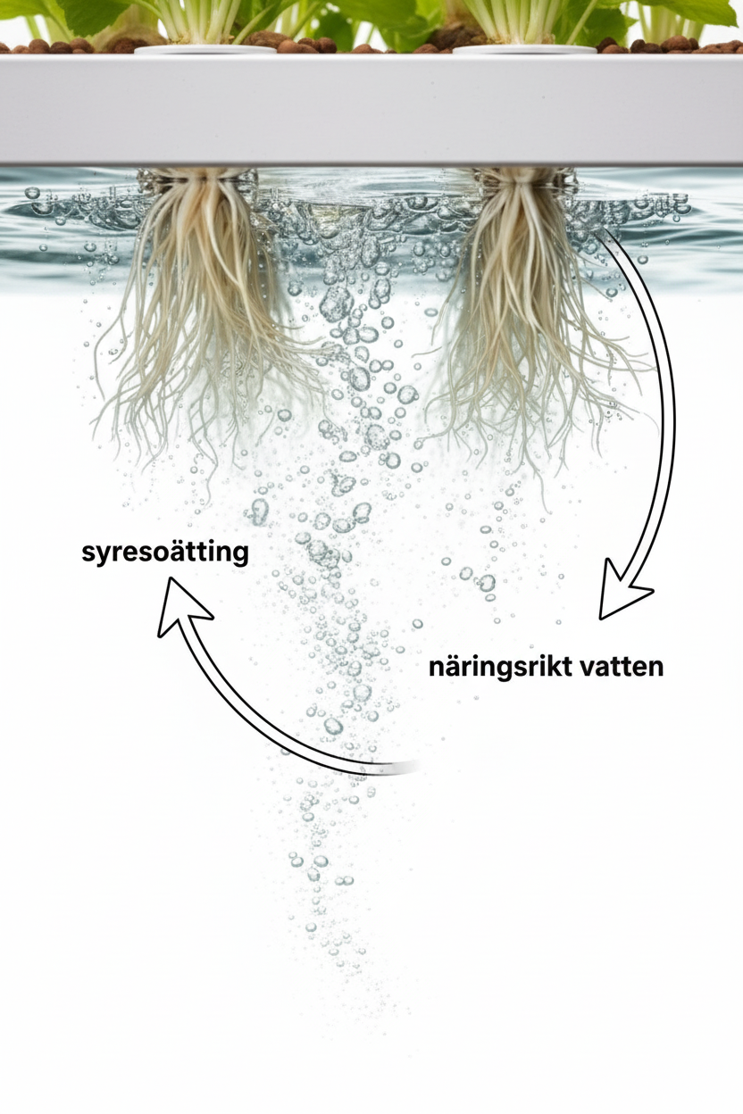 För ökad syresättning fylls vattnet med extra syre för fiskarna och växterna.