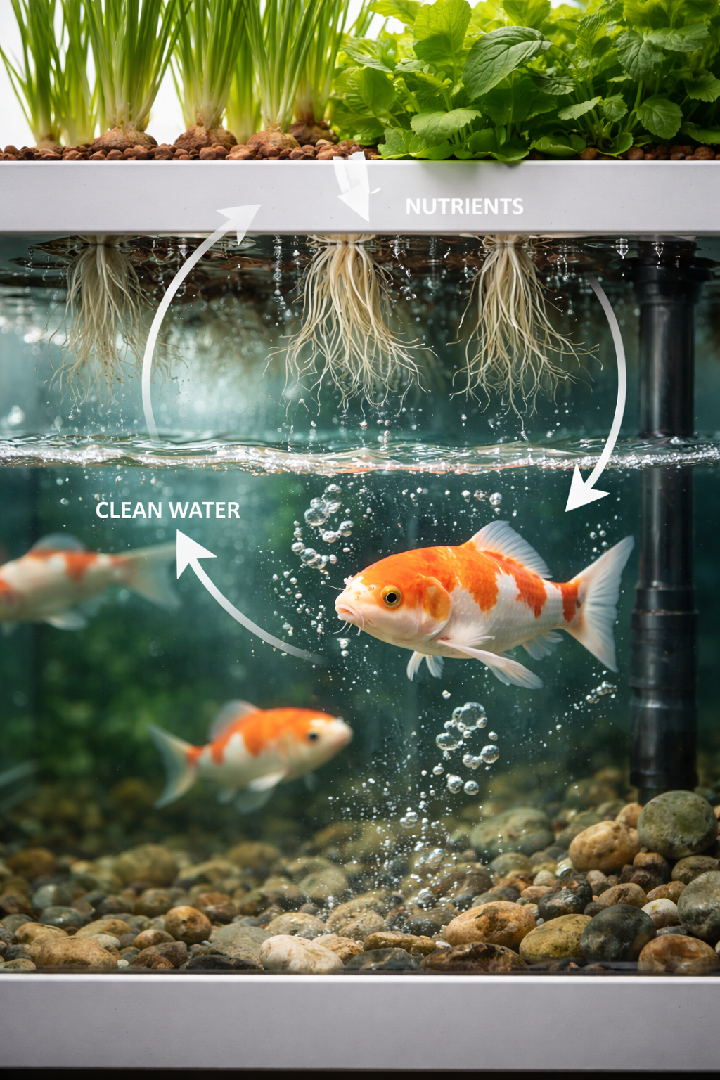 Fiskarna ger näring till växterna. Växterna syresätter och renar vattnet.